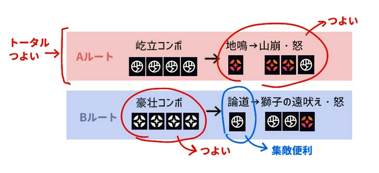結論、Aルートつよいんでここ擦っとけばヨシ。7割マスターくらい言っていいだろただ、集敵とか豪壮コンボの火力とか、Bルートにも意味はある